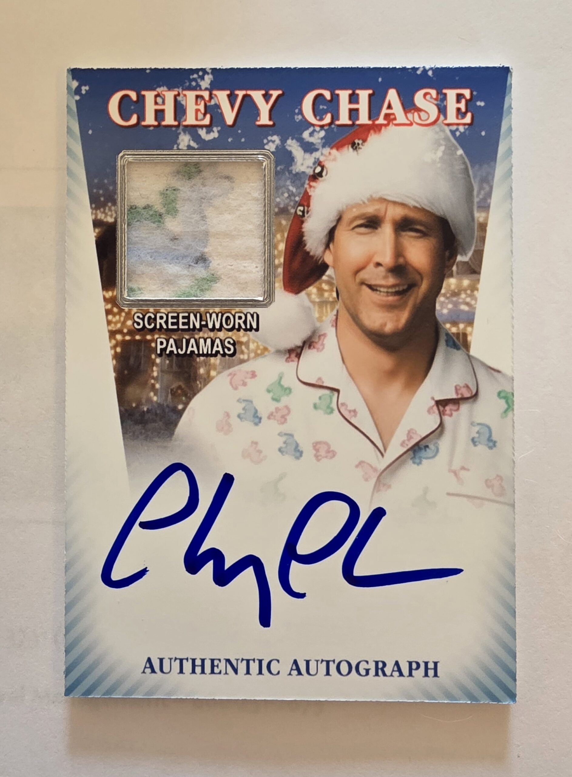 Embedded in this special limited edition (only 60) card is a piece of the actual pajama pants worn by Chevy Chase in the movie Christmas Vacation.  This limited edition of only 60 cards also features Chevy Chase’s autograph.  Each card is numbered up to 60 on the back.